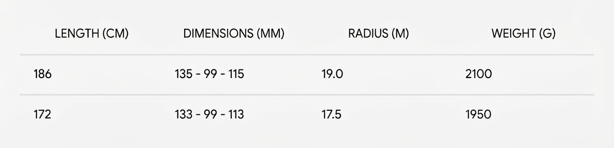 Through the intentional use of two layers of full-width triaxial fiberglass, we struck the perfect balance of longitudinal and torsional stiffness. The interplay of these two stiffness axes is part of the recipe that makes the skis stable at high speeds while remaining playful in their turn initiation qualities at slow speeds.
